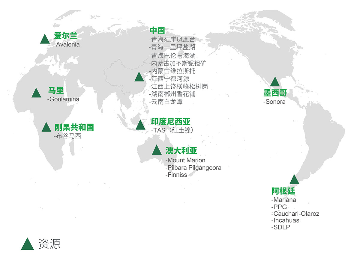 公司在全球范圍內(nèi)進(jìn)行資源布局,在澳大利亞、阿根廷、墨西哥、愛爾蘭、馬里、剛果共和國和中國青海、內(nèi)蒙古、江西、湖南、云南等地,持有多處優(yōu)質(zhì)礦源。