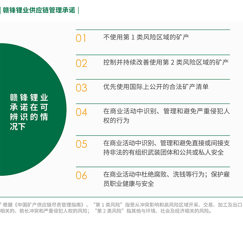 對于生產(chǎn)過程中可能涉及的鋰金屬礦產(chǎn)資源使用情況,公司堅持道德采購,承諾不使用來自沖突地區(qū)的礦產(chǎn)資源,也明確要求供應商不得使用來自沖突地區(qū)及違反公司政策的礦產(chǎn)資源。為處理負責任礦產(chǎn)供應鏈的風險與隱患,公司常態(tài)化沖突礦產(chǎn)專項管理,并根據(jù)海內外業(yè)務動態(tài)不斷進行完善。公司經(jīng)營人員在澳大利亞、阿根廷、墨西哥、愛爾蘭等地投資參股鋰礦權項目并擔任董事,與其簽訂包銷協(xié)議,通過股權與包銷協(xié)議的方式,確保礦原材料的來源、運輸路徑明確,達到風險可控、可追溯的目的。