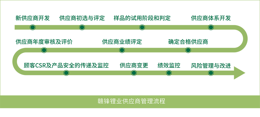 贛鋒鋰業(yè)高度重視鋰供應鏈的安全,因為這直接關系到新能源產(chǎn)業(yè)的發(fā)展。我們將可持續(xù)發(fā)展的理念納入采購流程,積極采購環(huán)境友好型產(chǎn)品,并制定《供應商行為準則》,從守法經(jīng)營、合規(guī)用工、資源消耗、排放控制、健康與安全、商業(yè)道德等方面引導和規(guī)范供應商行為。贛鋒鋰業(yè)堅持以可持續(xù)發(fā)展為導向的責任供應鏈決策,積極探索責任供應鏈塑造工作,承擔產(chǎn)業(yè)上下游的責任傳遞,降低產(chǎn)業(yè)鏈上社會與環(huán)保風險,確保產(chǎn)業(yè)經(jīng)濟價值與環(huán)境價值的雙重實現(xiàn)。