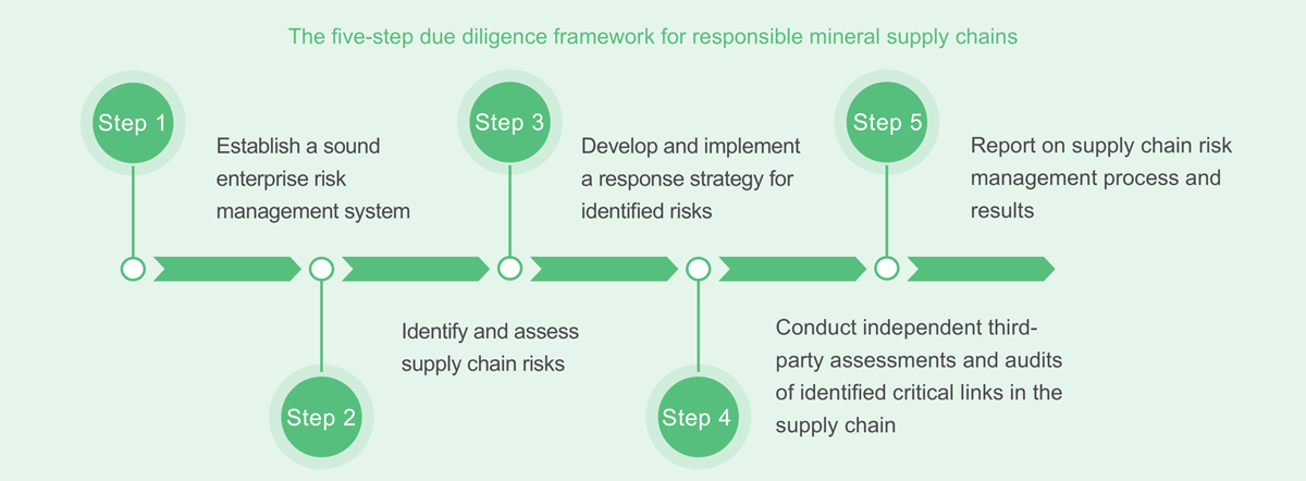 The Company updated the Due Diligence Management Control Procedures for Responsible Mineral Supply Chains and other documentation in 2021, headed by the Company’s Due Diligence Management Team for Responsible Supply Chains, and advanced the due diligence management of lithium supply chains. The Code of Conduct for Suppliers incorporates Ganfeng Lithium’s standards for suppliers to guide and regulate upstream lithium mine suppliers’ behaviour. It encourages them to adopt more environmental and social obligations. The OECD Due Diligence Guidance for Responsible Supply Chains of Minerals from Conflict-Affected and High-Risk Areas, the Guidelines for Social Responsibility in Outbound Mining Investments, and the Chinese Due Diligence Guidelines for Responsible Mineral Supply Chains are used to manage the sustainability of lithium raw material supply chains. The Company has consistently followed the “five-step process” in due diligence management of lithium supply chains and the supplier management principles of “transparency in the supply chain, responsible procurement, no human rights issues, and minimum environmental impact”. To maintain secure lithium supply chains, we review supplier information on a regular basis to understand their links, such as raw material mining, shipping, and processing.